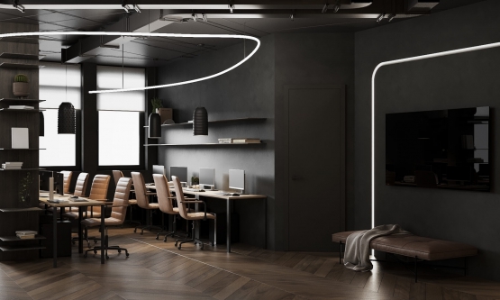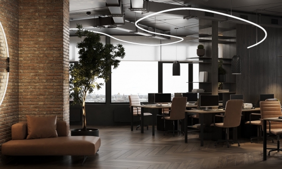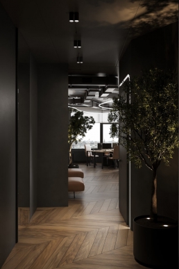 High office ceilings allow to place natural accents such as living trees. The large windows give the office enough daylight to cover areas of natural wood.